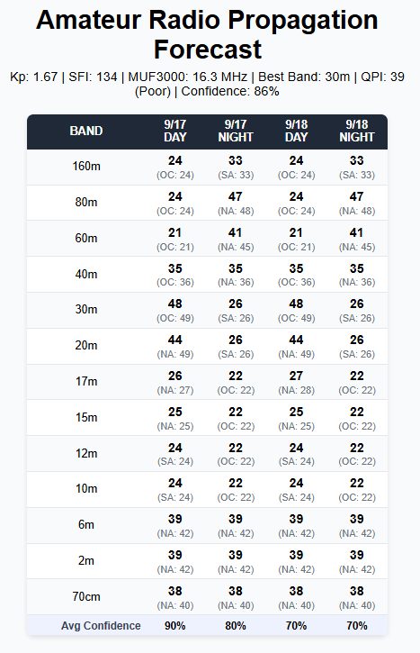 This is the QSO Probability Index (QPI). It’s a percentage (0-100) that represents the probability that I’m going to make some decent contacts and have a good time on a particular band at a particular time. So, if I look at tomorrow, I can hop on 20 meters and have a pretty average day. In finer print underneath each entry, it shows the region that is performing best (North America, South America, Europe, Africa, Asia, or Oceana).