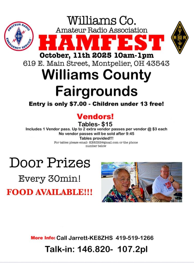 I just got this flyer from Stan, W8SRD, who informed us on the Thursday net that the Williams County club had an upcoming hamfest that everyone should pay a visit: