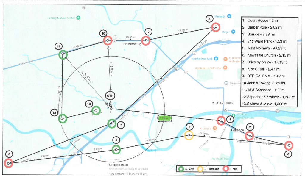 With zero contacts made I decided to find out for myself just how far I could receive a RF mobile node. I drove a route and sent messages from 13 documented stops. Then back to me home QTH to see which messages arrived. Here are the results.