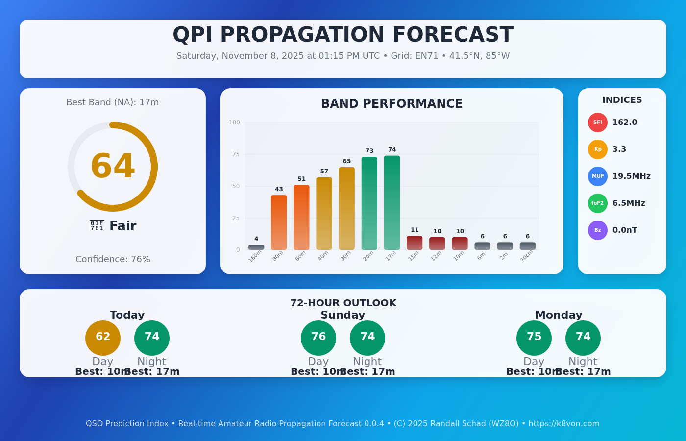2025-09-27 — Made some major overhauls to the HF prediction formula. These should be much more accurate, though I know there are still some modifications required. Also made some minor legibility improvements to the graphics. 6m and higher are not calculated yet and should be ignored.